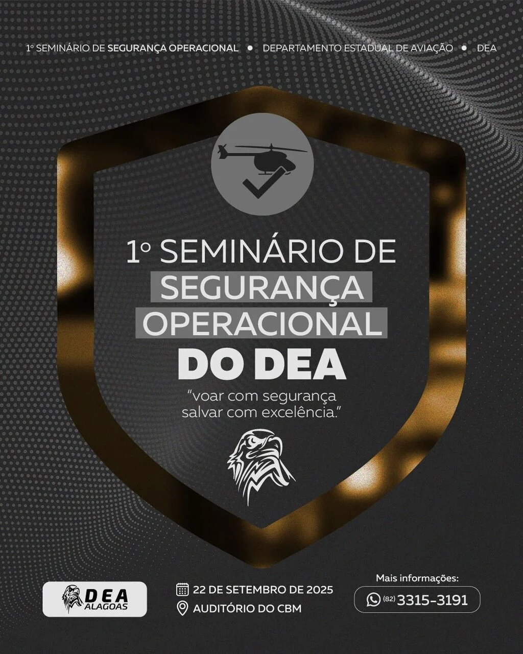 O Departamento Estadual de Aviação (DEA) realiza, nesta segunda-feira, 22, o 1º Seminário de Segurança Operacional, com o tema “Voar com segurança, salvar com excelência”. O encontro acontece no auditório do Corpo de Bombeiros Militar de Alagoas (CBM), das 8h às 17h30, e reúne especialistas, militares e técnicos para debater práticas e protocolos que garantem a eficiência e a segurança das operações aéreas.