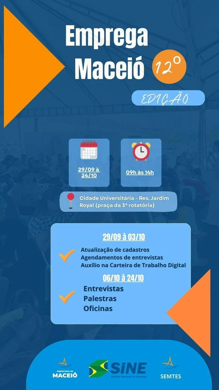 A 12ª edição do Emprega Maceió já tem data para começar e promete ser uma das mais abrangentes até agora. Entre os dias 29 de setembro e 24 de outubro, moradores da capital alagoana poderão participar da ação promovida pela Secretaria Municipal de Trabalho, Emprego e Economia Solidária (Semtes).