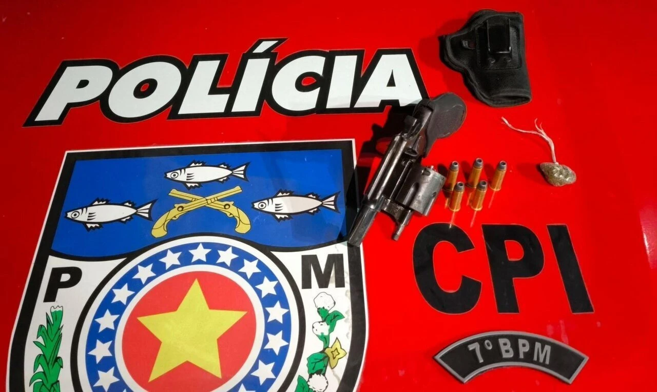 Ao averiguar a denúncia inicial, as equipes encontraram uma bombinha de maconha com um indivíduo, que informou ser usuário de drogas. Durante diligências no perímetro, os policiais também encontraram a arma de fogo em cima de uma mesa.