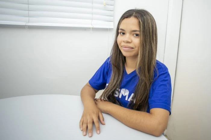 Layza Santos também participou da ação quando tinha 16 anos. Aos 18 anos de idade, ela celebra o emprego conquistado e a independência financeira, ao trabalhar como recepcionista em uma instituição de ensino superior.