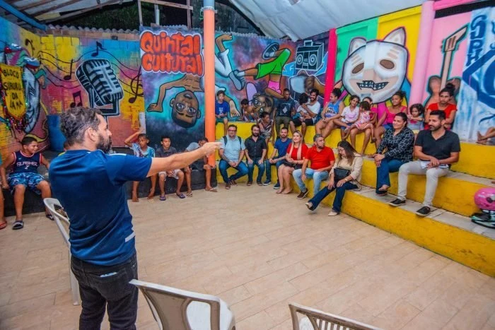 Caminhando por vielas, chega-se a um beco onde a arte ganha vida, com paredes coloridas adornadas por artistas locais. No final, uma porta com a inscrição “Quintal Cultural”. Ao cruzar o limiar, a equipe da Secult foi recepcionada por um ambiente efervescente, onde a arte pulsa. Uma pequena arena abrigava uma animada oficina de Coco de Roda, com uma multidão participativa, atenta e mergulhada na cultura local.